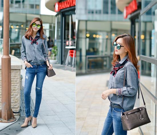 Nếu bạn muốn xây dựng vẻ ngoài năng động và hiện đại thì nên lựa chọn áo sơ mi kết hợp với quần jeans. Cách nhấn nhá chiếc khăn kẻ sọc thắt hình nơ ở cổ sẽ giúp bạn thêm đáng yêu, dịu dàng trước đồng nghiệp. Đương nhiên, túi đeo vai, giày cao gót là không thể thiếu đối với một quý cô đẳng cấp.