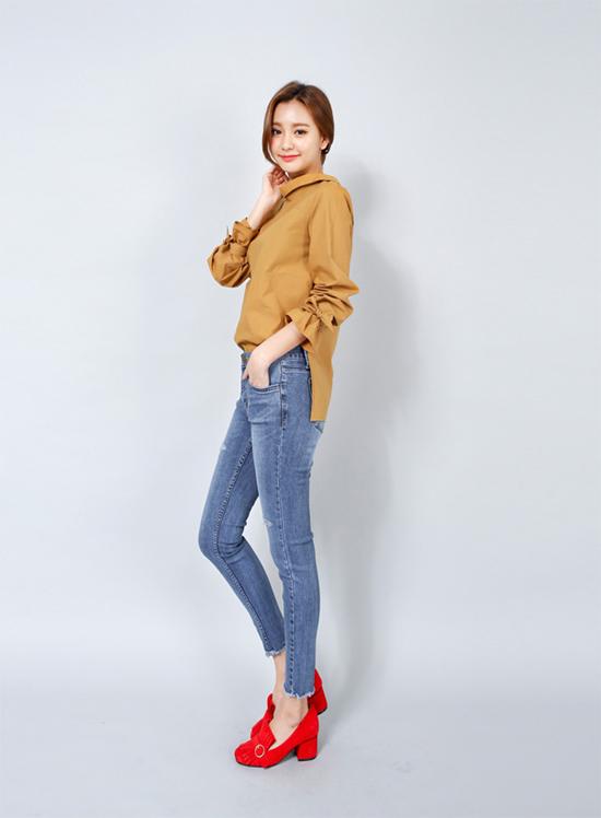 Kiểu áo sơ mi ngược xuất hiện từ vài mùa nay nhưng đến thu này, nó vẫn là chiếc áo khiến bạn phải mê đắm. Quần jeans rách nhẹ, áo sơ mi ngược màu vàng bò và giày đỏ sẽ khiến bạn vô cùng sành điệu, thời thượng.