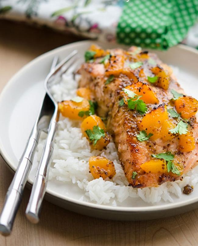 Món ăn cá hồi nướng đào không những đẹp mắt mà còn giàu chất dinh dưỡng, rất phù hợp để chiêu đãi cả nhà vào dịp cuối tuần.