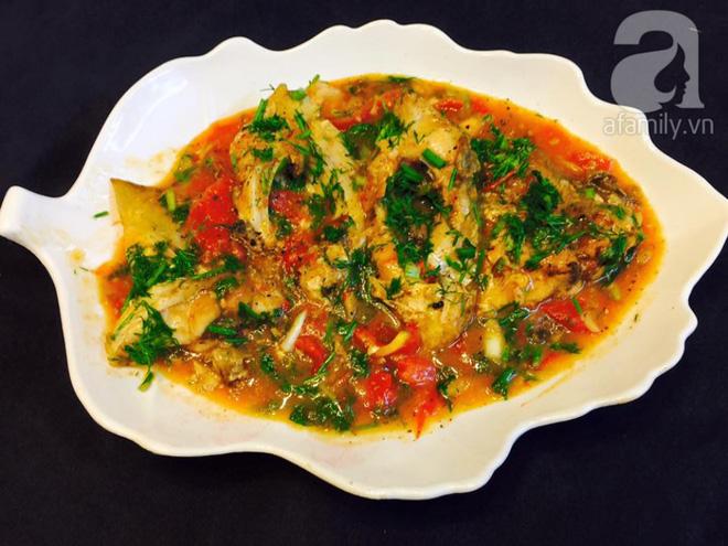 – Khi cà chua chín nhừ, bạn cho cá chiên vào chảo, sau đó cho vào chảo chút nước lọc pha chút bột năng, đun sôi nồi cá chừng 5 phút, nêm nếm lại gia vị cho vừa với khẩu vị, cho thì là và hành thái khúc vào nồi rồi tắt bếp.