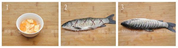 Bước 1: Chuẩn bị tất cả các nguyên liệu. Cá trắm rửa sạch, mổ bỏ ruột, khứa các đường ngang thân con cá cho gia vị ngấm và nhanh chín.