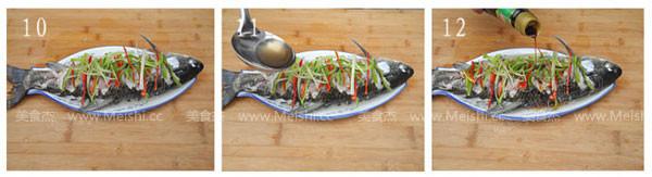 Bước 4: Cho cá hấp ra ngoài đĩa, rắc hành lá thái sợi, ớt chuông xanh đỏ lên trên. Rưới nước xì dầu hoặc kèm theo mắm nếu muốn cho đậm đà.