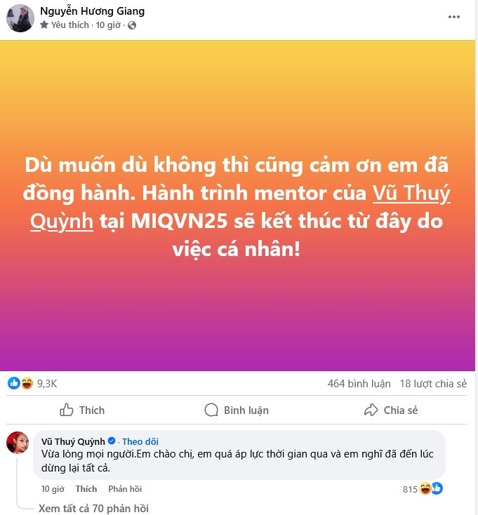 Hoa hậu chuyển giới viết: "Dù muốn dù không thì cũng cảm ơn em đã đồng hành. Hành trình mentor của Vũ Thuý Quỳnh tại MIQVN25 sẽ kết thúc từ đây do việc cá nhân!".
