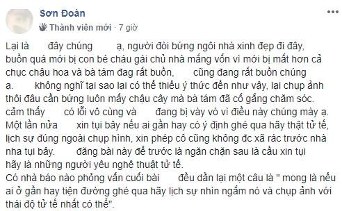"Nếu ai ở gần hay có ý định ghé qua hãy thật tử tế, lịch sự đứng ngoài chụp hình, xin phép cô và đừng xả rác trước nhà. Mình đăng bài này để trước là ngăn chặn, sau cầu xin mọi người hãy là những người yêu nghệ thuật tử tế", 9X viết trên Facebook.