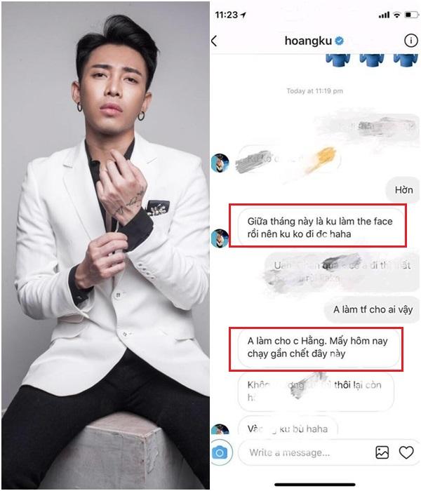 Mới đây, một fanpage đăng tải đoạn chat được cho là của stylist Hoàng Ku nói về việc sẽ lo liệu trang trang phục cho người chị tên Hằng tại The Face Vietnam 2018. Tuy không chỉ rõ là "Hằng" nào, song ai cũng hiểu nhân vật được anh hướng tới là siêu mẫu Thanh Hằng.