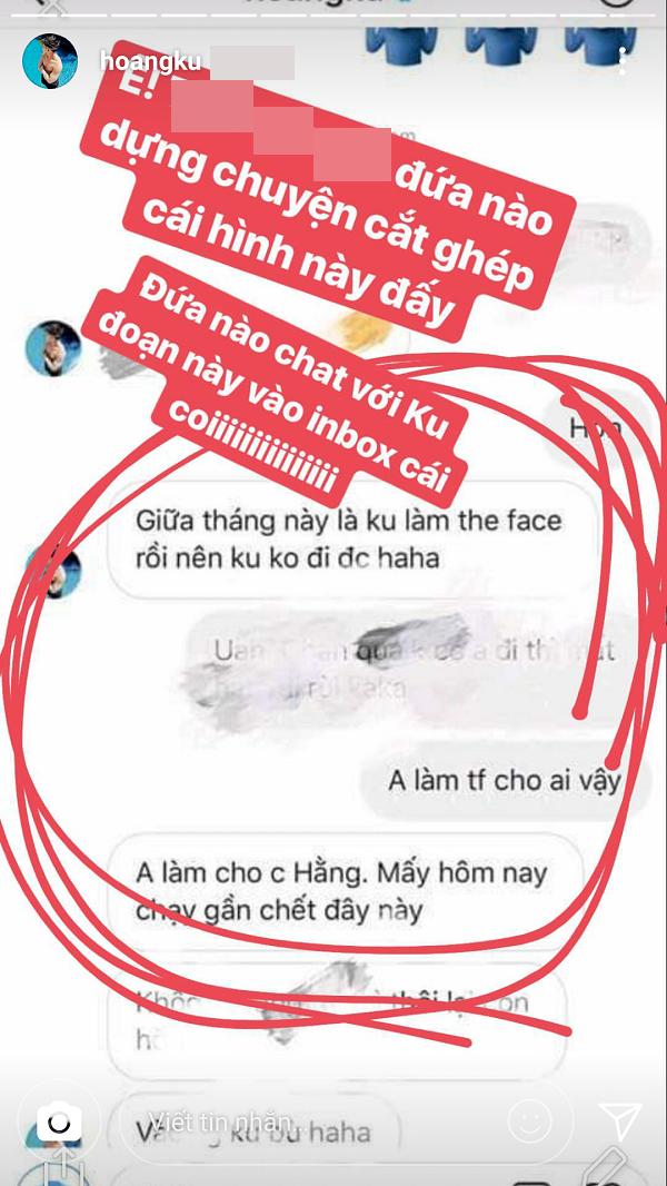 Không khẳng định hay phủ nhận việc Thanh Hằng ngồi ghế nóng, song Hoàng Ku chụp lại màn hình tin nhắn đang được lan truyền trên mạng xã hội và cho rằng đó là sản phẩm của cắt ghép.