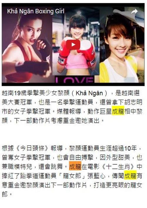Hôm 31/3 vừa qua, trang Appledaily – một trang mạng nổi tiếng ở Đài Loan đã đăng tải một bài báo ngắn về Khả Ngân - boxing girl của Việt Nam. Bên cạnh những thông tin giới thiệu cơ bản, thì bài báo còn gây chú ý khi tiết lộ thông tin rằng, ngôi sao quốc tế Thành Long đang có dự định muốn mời hot girl Khả Ngân tham gia bộ phim sắp tới của mình. "Tin đồn" này đã nhanh chóng làm các fan của Khả Ngân phải xôn xao bàn tán.