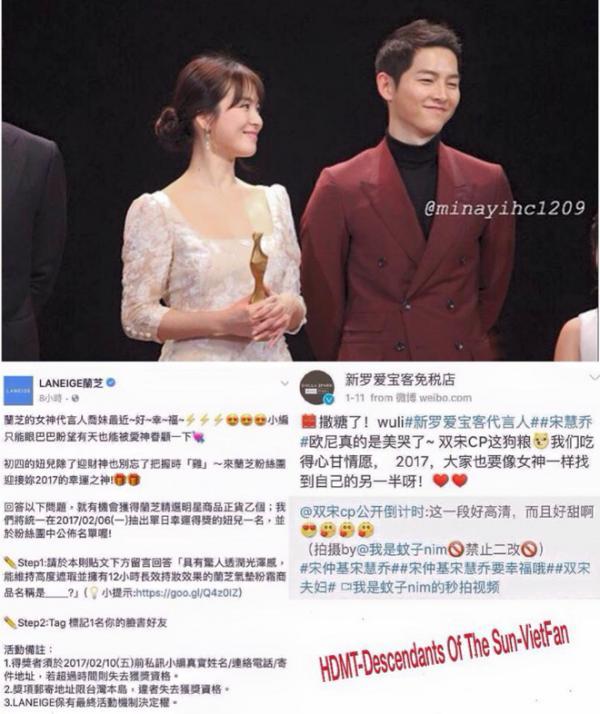 Trong 2 ngày gần đây, một fanpage hâm mộ drama "Hậu Duệ Mặt Trời" khiến các fan khấp khởi mừng thầm khi đăng tải thông tin cặp đôi Song Hye Kyo - Song Joong Ki chuẩn bị làm đám cưới vào năm 2017. Cụ thể, fanpage này đã chụp lại dòng trạng thái của 2 trang Facebook và Weibo nhãn hàng do Song Hye Kyo đại diện, khẳng định rằng 2 trang này đã thông báo nữ diễn viên xinh đẹp này sẽ làm đám cưới trong năm 2017.