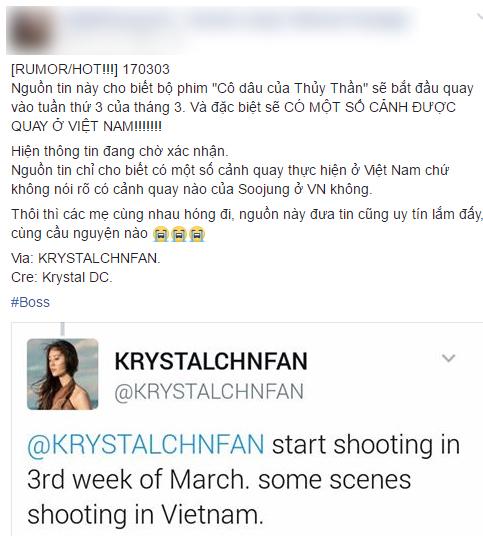 Được biết, nguồn tin xuất phát từ một fanpage khá đình đám của nữ ca sĩ Krystal trên facebook. Cụ thể, vào ngày 3/3, fanpage này đã đăng tải đoạn tweet của một tài khoản hâm mộ Krystal trên Twitter, với nội dung: "Bộ phim sẽ bắt đầu ghi hình vào tuần thứ 3 của tháng Ba. Một số cảnh quay sẽ được thực hiện tại Việt Nam". Ngoài ra, mặc dù đoạn tweet không hề ghi nguồn thông tin, bài viết của fanpage trên facebook lại có "credit" trang DC Inside của Krystal (DC Inside là một diễn đàn internet được nhiều người sử dụng tại Hàn).