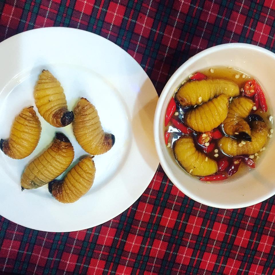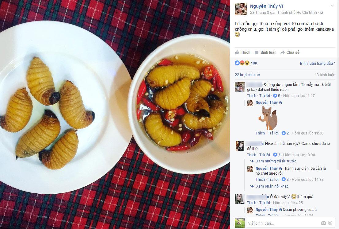 Hình ảnh đi ăn con đuông dừa cùng một người bạn được Thúy Vi chia sẻ. Cô nàng tỏ ra rất yêu thích món ăn này.