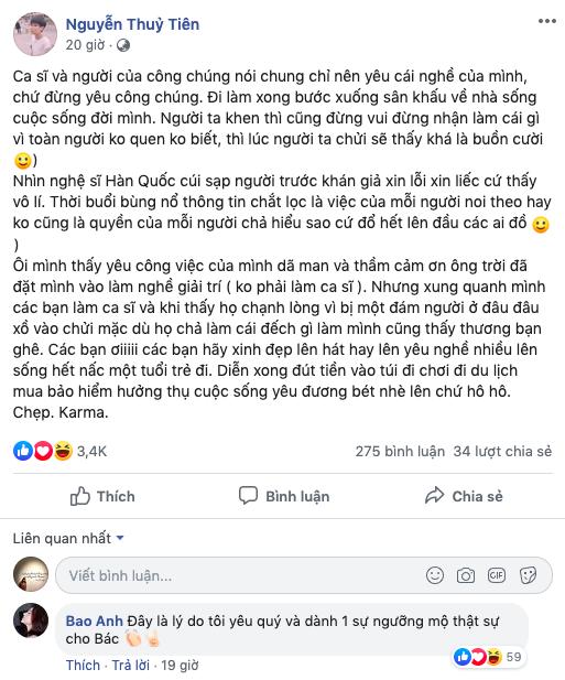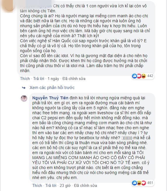 Tuy nhiên, một bộ phận không nhỏ khán giả lại thấy “nóng mắt” trước chia sẻ trên. Nhiều người nhận định tư tưởng của nữ nhạc sĩ là ích kỷ, thiếu tôn trọng khán giả. Dẫu vậy, chủ nhân hit Tâm sự cùng người lạ vẫn giữ vững quan điểm của mình, và thậm chí còn đáp trả lại bằng một bình luận dài với lời lẽ khá hằn học.