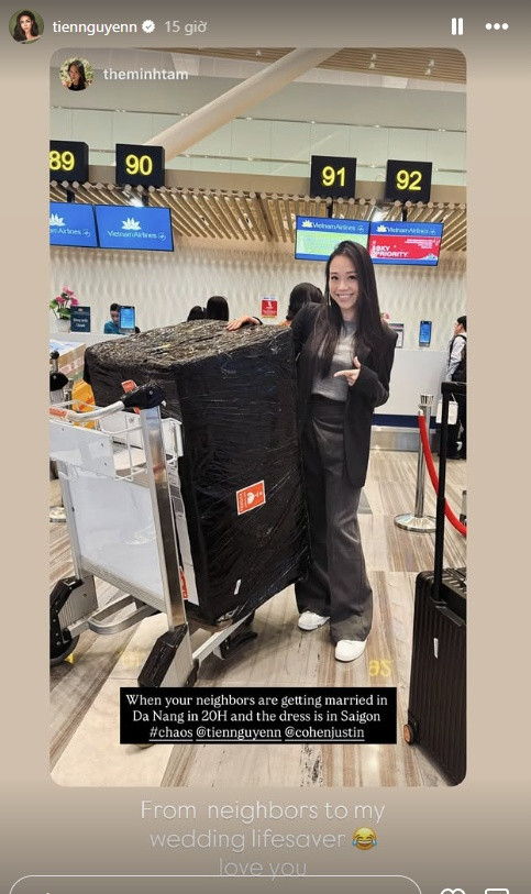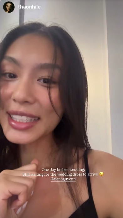 Mới đây, nàng hậu cập nhật tình huống thú vị trước giờ G của cô dâu Tiên Nguyễn. Theo đó, dù sắp đến lúc diễn ra hôn lễ nhưng váy cưới của Tiên Nguyễn vẫn ở TP.HCM chưa được chuyển đến Đà Nẵng.