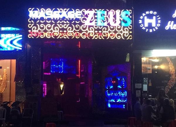 Cơ sở massage Zeus nằm ở khu vực phố Tây, nổi tiếng với dàn tiếp viên trẻ đẹp, biết chiều khách. Trước đó nơi này bị phát hiện có tiếp viên đang kích dục cho khách.