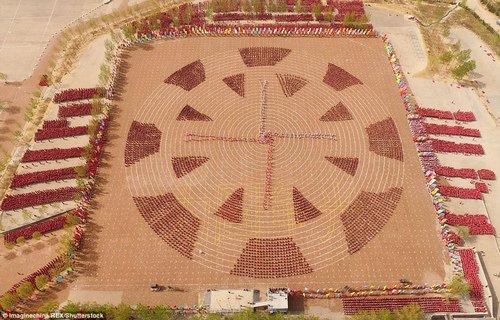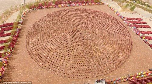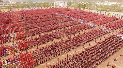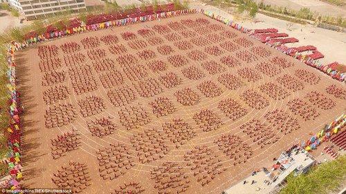 Điều khó tin là tiết học này là buổi học tập thể của hơn…26.000 học viên. Một máy quay trên không được sử dụng để ghi lại toàn bộ tiết học. Nó cho thấy, các học viên tập hợp và tập võ thành các hình khối như tạo thành một vòng tròn khổng lồ, hình vuông hay sọc.