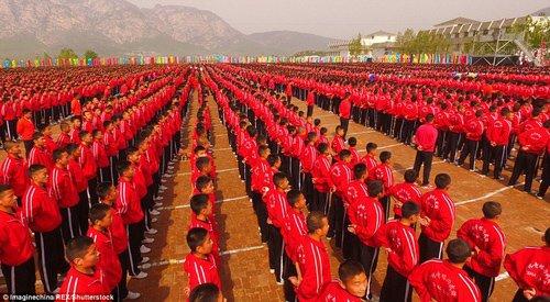 Hình ảnh thú vị: Tất cả các học viên phải quay mặt về phía một người đàn ông đang tập luyện kungfu ở giữa.