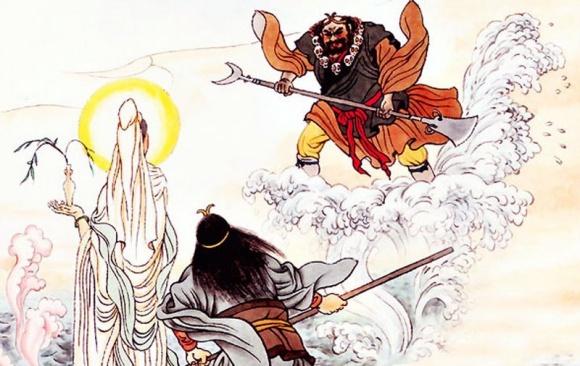 Quan Thế Âm cùng Tôn Ngộ Không thu phục Sa Tăng.