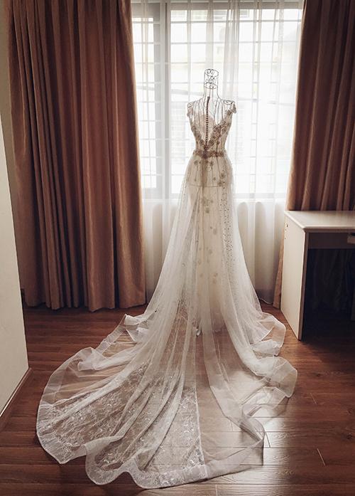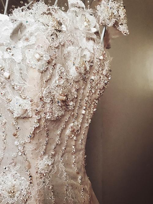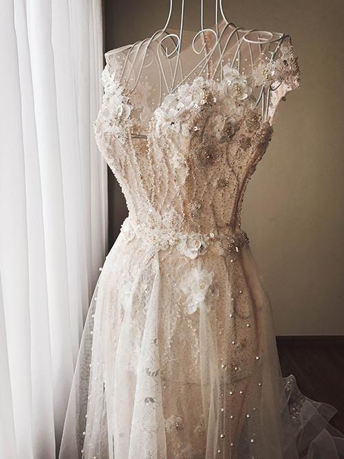 Nhà thiết kế Phương Linh đã dành hơn 300 giờ đồng hồ để hoàn thiện bộ soiree với nguyên liệu chính từ ren Pháp và pha lê ngoại nhập.
