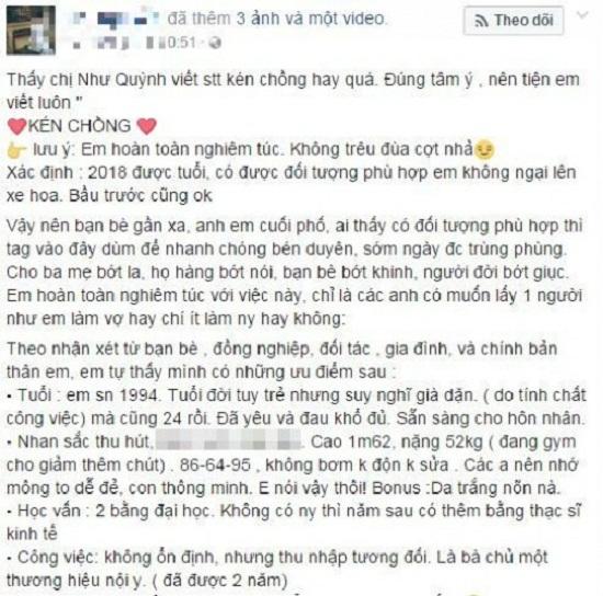 Vì muốn tìm được một người tương xứng với mình nên cô gái này quyết định chia sẻ status trên facebook.