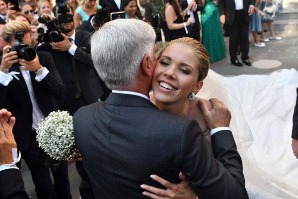 Ông Paul Swarovski - cha Victoria - là người dắt tay con gái băng qua lễ đường nhà thờ San Giusto đến nơi chú rể đang chờ đợi để trao lời hẹn ước. Trong ảnh, Victoria ôm một vị khách sau màn thề nguyện với bạn đời.