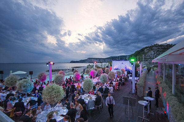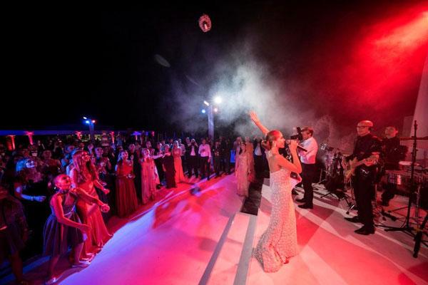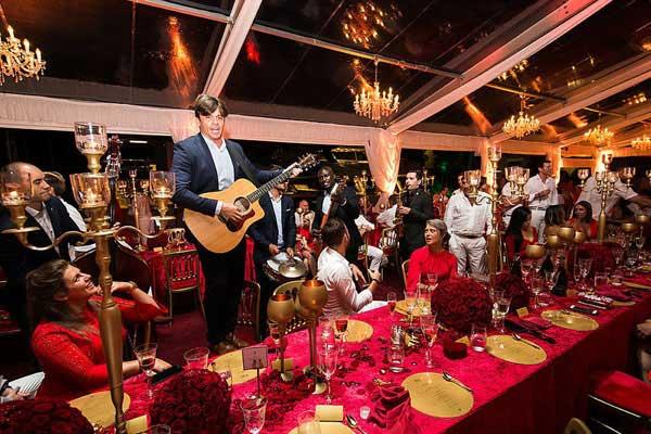 Sau hôn lễ tại nhà thờ, quan khách được chiêu đãi tiệc rượu tại nhà hàng Maxi's Restaurant Portopiccolo lúc 8h tối. Địa điểm này cũng được trang hoàng bằng hàng nghìn viên pha lê Swarovski lấp lánh.
