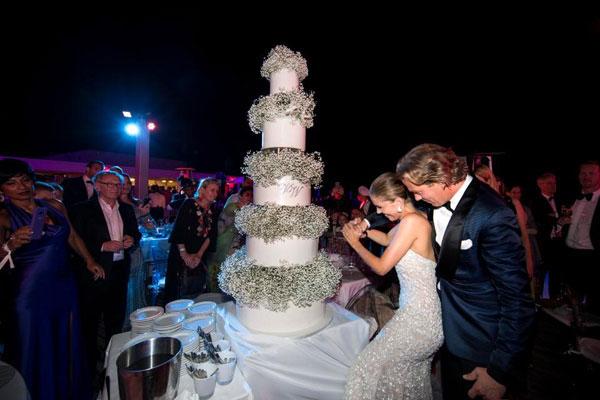 Tâm điểm của tiệc rượu sau đám cưới là chiếc bánh kem 5 tầng được trang trí đẹp mắt, sau đó là màn trình diễn pháo hoa sáng rực cả bầu trời đêm.