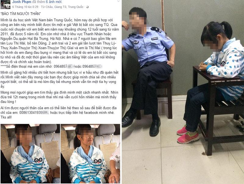 Trước đó, ngày 6.10, Facebooker có nickname Jonh Phạm (tên thật là Phạm Văn Mạnh - một du học sinh người Việt Nam tại Giang Tô, Trung Quốc) chia sẻ trên trang cá nhân thông tin, một bé gái là người Việt Nam bị bắt cóc sang Trung Quốc và đang có thai.