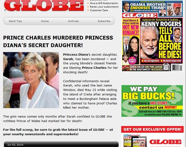 Mới đây nhất, Globe tiếp tục đăng tải thông tin gây sốc với tiêu đề “Thái tử Charles ám sát con gái bí mật của công nương Diana” ngày 2/6/2016. (Ảnh chụp màn hình tạp chí Globe) Theo bài viết, người phụ nữ được cho là con gái bí mật của công nương Diana đã qua đời ngày 15/5 vừa qua trong chuyến du lịch tới đảo Crete. Bạn thân cô cho rằng thái tử Charles đã sát hại cô sau khi cô tố cáo ông dính líu đến cái chết của mẹ mình, công nương Diana.