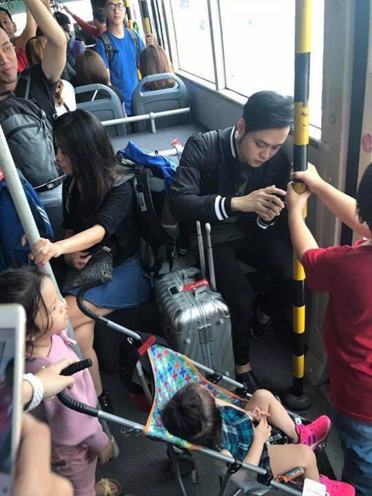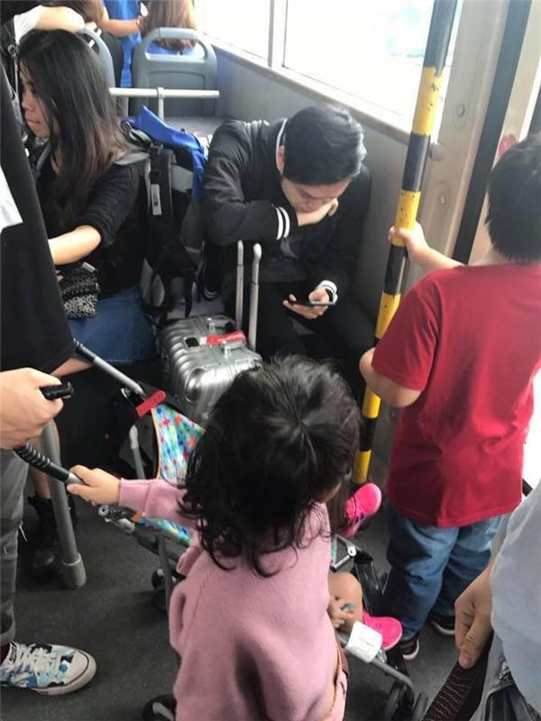 Quang Vinh thản nhiên ngồi bấm điện thoại, trong khi có hai em nhỏ đang phải đứng trên xe buýt.