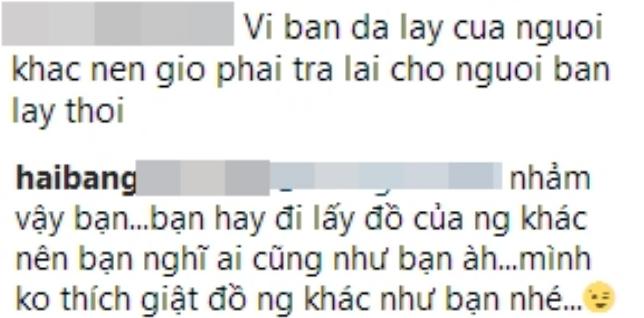Rất nhanh, bạn gái của Thành Đạt lên tiếng đáp trả. Không chỉ mắng người buông lời nhận xét không hay về mình là "nhảm", Hải Băng còn khẳng định cô không có thói quen thích giật đồ người khác. "Nhảm vậy bạn... bạn hay đi lấy đồ của người khác nên bạn nghĩ ai cũng như bạn à... mình không thích giật đồ người khác như bạn nhé", Hải Băng viết.