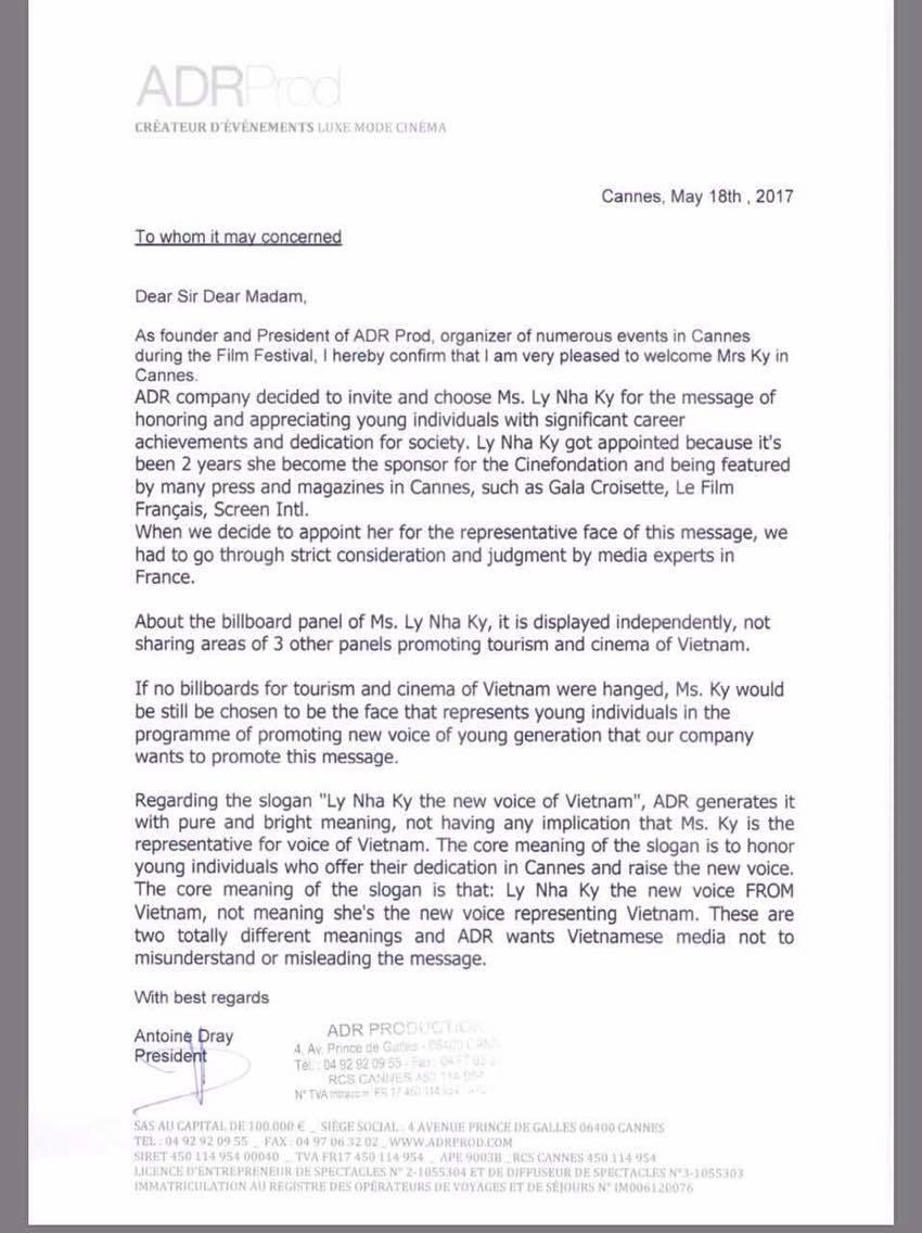 Trong khi thị phi đang bủa vây mỹ nhân họ Lý, Chủ tịch đồng thời là người sáng lập công ty tổ chức các sự kiện tại Cannes ADR Pord - Antoine Dray chính thức gửi thư tới cơ quan báo chí truyền thông Việt Nam để nói rõ về việc này.