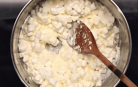- Bạn cho kẹo marshmallows vào nồi và đun chảy, vừa đun vừa khuấy cho hỗn hợp quyện mịn.
