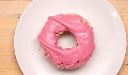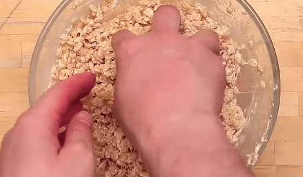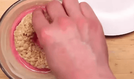 - Thoa 1 chút bơ vào lòng bàn tay, lấy lượng bỏng gạo vừa đủ rồi nặn thành hình bánh vòng rồi đặt sang 1 bên.