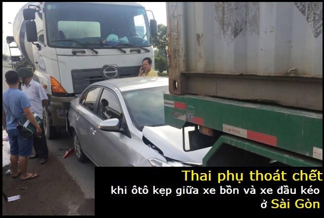 Thai phụ thoát chết hy hữu khi ô tô kẹp giữa xe bồn và xe đầu kéo