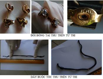 Tại đây, cơ quan chức năng thu được một đôi bông tai bằng kim loại màu vàng (có ký hiệu chữ KHL, hình bông mai và số 5) dính trên tóc và một sợi dây thun buộc tóc màu đen.