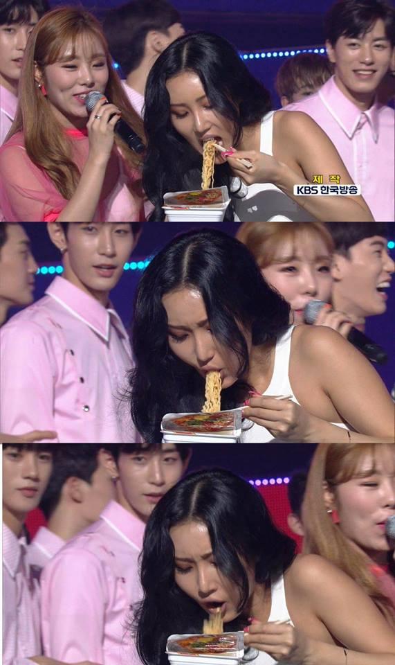 MAMAMOO đã thực hiện lời hứa ăn mì ngay trên sân khấu của chương trình âm nhạc Music Bank sau khi giành chiến thắng trước Big Bang G-Dragon