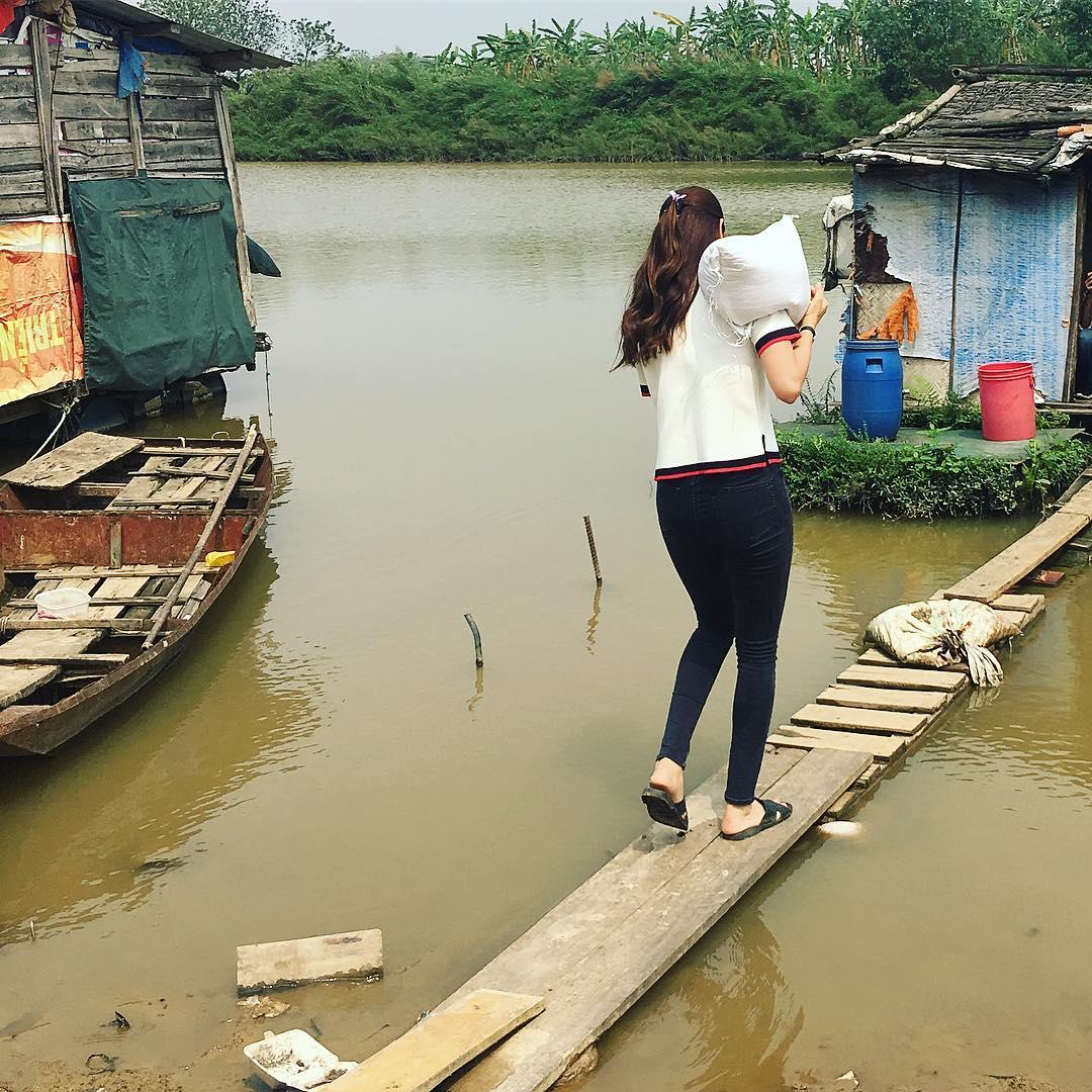 Trái ngược với hình ảnh váy áo hàng hiệu sang trọng đi giày cao gót tại sự kiện, Phạm Hương ghi điểm bởi vẻ đẹp giản dị đi dép lê, vác bao gạo mang tình yêu thương đến với người dân gặp khó khăn.