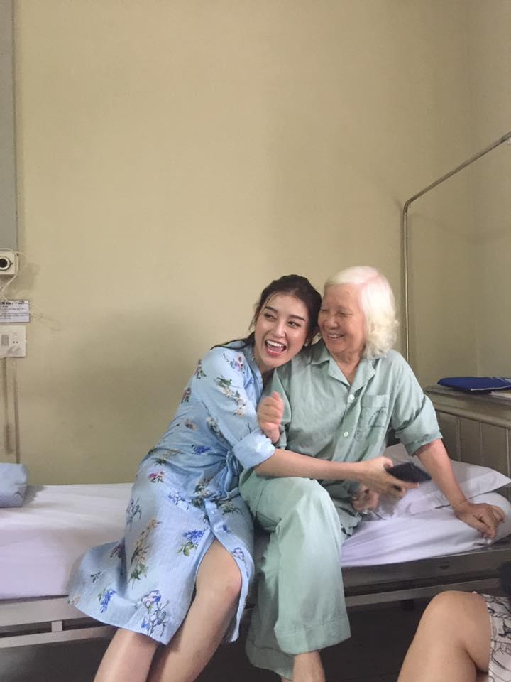 Huyền My mở đầu tin tức sao Việt với chia sẻ giây phút thoải mái bên người bà thân thương: "Vào viện thăm bà. Mỳ yêu bà nhất, bà lúc nào cũng bênh Mỳ nhất".