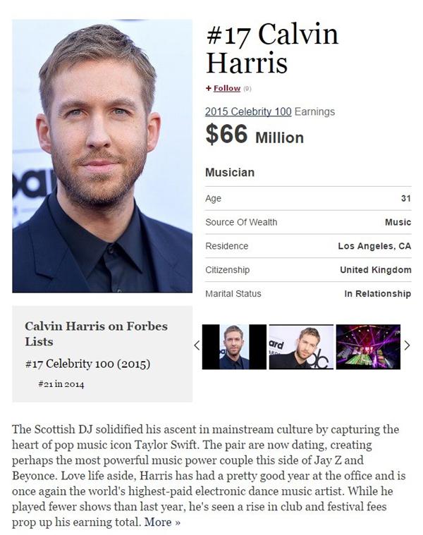 Trong năm 2014, Calvin Harris được tạp chí Forbes bầu chọn là DJ kiếm nhiều tiền nhất năm với số tiền là 66 triệu USD (hơn 1.800 tỉ đồng).