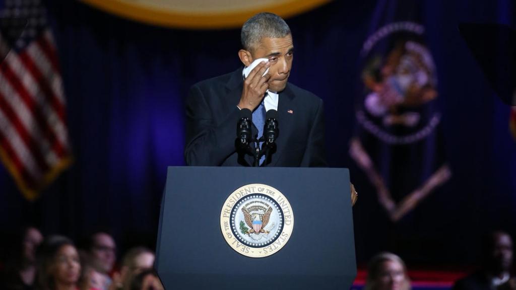 Cựu Tổng thống Mỹ lấy khăn tay trắng và lau đi nước mắt khi nói về vợtrong bài phát biểu chia tay Nhà Trắng