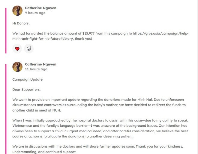Do những tình huống bất ngờ và tranh cãi xung quanh người mẹ của bé, chúng tôi đã quyết định chuyển số tiền này cho một trẻ em khác đang cần giúp đỡ tại NUH (Bệnh viện Đại học Quốc gia Singapore)", chia sẻ của tài khoản Catherine Nguyen.