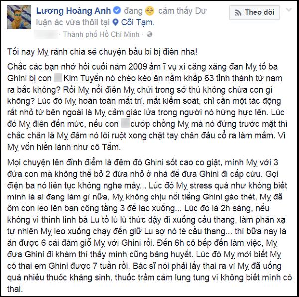 Hồi tưởng lại ồn ào tình ái cuối năm 2009, lời văn của Lương Hoàng Anh bộc lộ rõ cảm xúc tức giận. Phát hiện Kim Tuyến "chèo kéo ăn nằm" với chồng, cô đã nổi điên tới mất kiểm soát dù đang mang trong mình giọt máu thứ 2 của nam diễn viên Dốc tình.