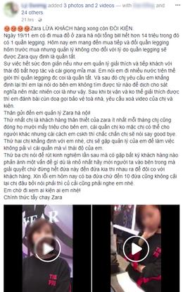 Được biết, chủ nhân đăng clip và dòng trạng thái tố cáo thậm chí đòi kiện nhãn hàng lừa đảo có tên L.D. Theo đó thì vị khách này đã đến Zara mua hàng ngày 19/11, bao gồm sản phẩm quần legging. Đến ngày 11/12, chị trở lại mua sắm và muốn đổi món hàng nhưng quản lý chính không đồng ý bởi sản phẩm này thuộc quy định không được phép đổi trả.