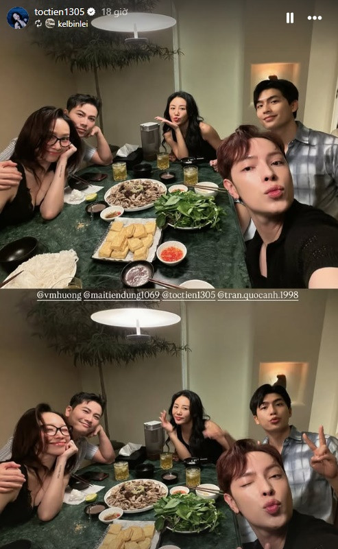 Mới đây, Tóc Tiên chia sẻ hình ảnh tụ tập bên hội bạn gây chú ý. Trong khung hình có sự xuất hiện của ca sĩ Mai Tiến Dũng, stylist Kelbin Lei, ca sĩ Văn Mai Hương, diễn viên Quốc Anh. Đặc biệt, ông xã Tóc Tiên vẫn vắng bóng trong các buổi tụ họp của cô cùng hội bạn thân.
