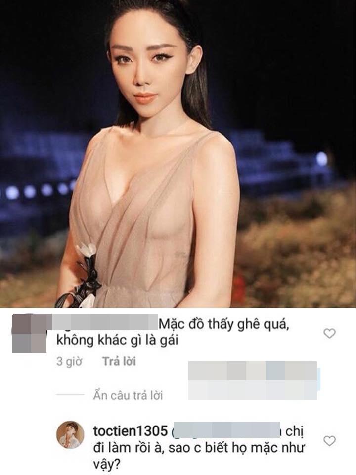 Trước ý kiến chê bai của khán giả, Tóc Tiên đã có màn đáp trả cực gắt: "Chị đi làm rồi à, sao chị biết họ mặc như vậy?". Lời đáp trả ngắn gọn nhưng cực kì đanh thép khiến cư dân mạng này phải "chào thua".