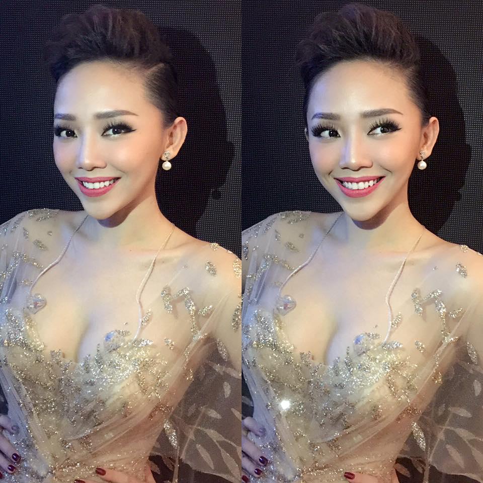 Xuất hiện trong chương trình The Face, Tóc Tiên cũng trưng dụng một thiết kế xuyên thấu khoe triệt để đường cong cơ thể.