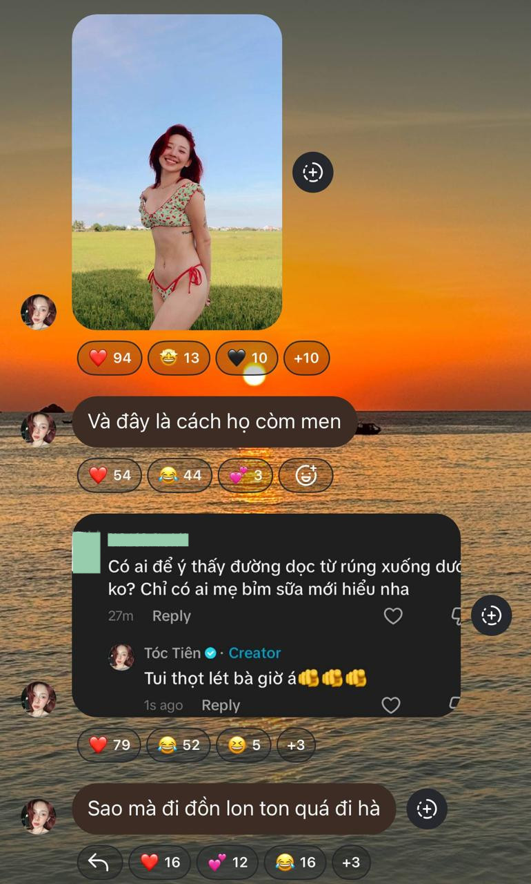 Giữa lúc ồn ào, mới đây, Tóc Tiên phải lập tức lên tiếng đính chính thông tin mang thai. Theo đó, một cư dân mạng đã để lại bình luận soi chi tiết rãnh bụng trong loạt ảnh bikini mới nhất của giọng ca 8x. Người này cho hay: "Có ái để ý thấy đường dọc từ rốn xuống dưới không chỉ có mẹ bỉm sữa mới hiểu nha".