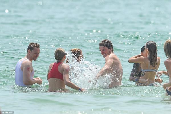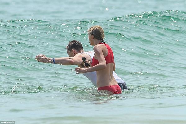 Diện bộ bikini đỏ nổi bật, dọng ca Shake It Off nô đùa vui vẻ dưới nước cùng Tom, trong khi Tom mặc áo ba lỗ trên có dòng chữ "Anh yêu em Taylor"