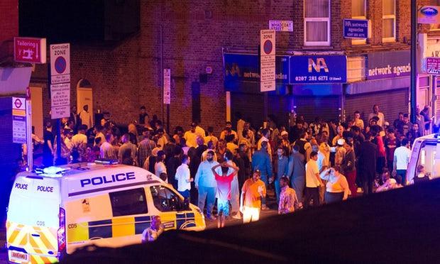 Cảnh sát nói chuyện với một người tại hiện trường. Một nhân chứng khác nói với LBC Radio rằng chiếc xe tông vào người đi bộ trên vỉa hè nhưng không đâm vào nhà cửa. "Trông như anh ta mất kiểm soát với chiếc xe hay sao đó", người này cho biết. Người dân địa phương nói rằng họ nghe tiếng la hét và âm thanh của máy bay trực thăng vần vũ bên trên. Ảnh: Guardian.