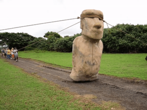 Kênh truyền hình National Geographic từng cho phát sóng tập phim nói về việc kỹ sư người Séc Pavel và nhà thàm hiểm người Na-Uy Thor Heyerdahl cùng đội ngũ của họ đã thử sử dụng sức kéo của con người để di chuyển một bức tượng đá khác tựa Moai cao 4m, nặng 9 tấn nhờ những sợi dây thừng. Trước đó khoảng 10 năm, một nhóm khảo cổ Mỹ khoảng 25 người đã di chuyển thành công một bản sao của Moai cao hàng chục mét, nặng gần 10 tấn bằng xe trượt tuyết.
