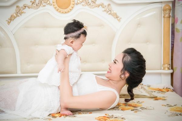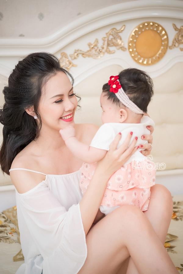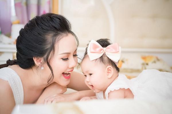Khi được hỏi về cảm xúc làm mẹ, top 5 Hoa hậu Việt Nam 2008 cười hạnh phúc kể, những ngày đầu chăm sóc con gái cô rất bỡ ngỡ vì chưa có nhiều kinh nghiệm. “Tôi chưa quen với việc chăm em bé nên việc thức trắng đêm để trông con đã khiến tôi rất mệt mỏi. Trong khi đó, cơ thể tôi vẫn chưa hồi phục sau sinh. Thế nhưng, may mắn là ông xã luôn ở bên hỗ trợ. Trong 2 tháng đầu tiên, anh dẹp mọi công việc để ở nhà chăm cả hai mẹ con”, cô tâm sự.